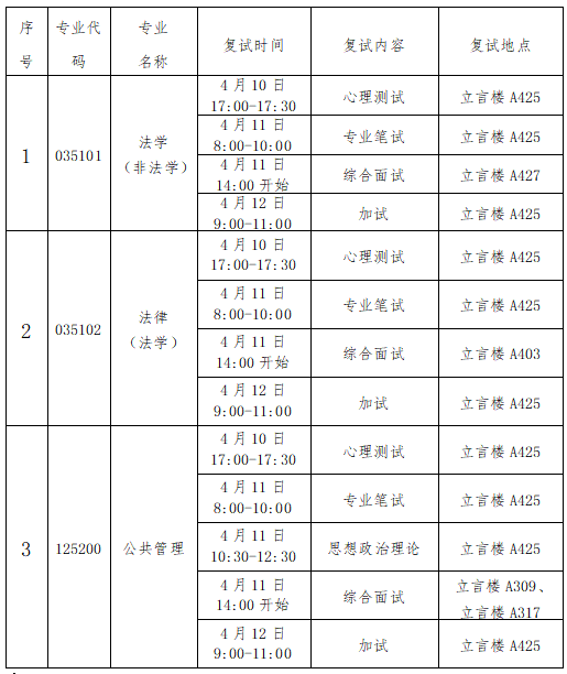 复试安排:2025年4月10日下午-4月12日,详细安排见下表。其中,报到和资格审查时间:2025年4月10日14:30-16:30;地点: 立言楼A314 。