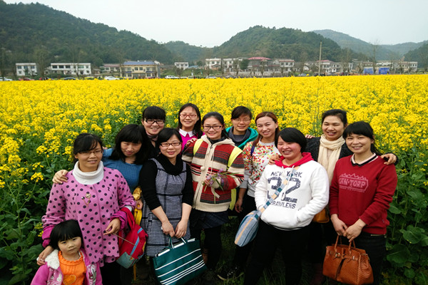 一眼望不到头的油菜花在阳光的照耀下闪着金色的光芒;一阵风吹过,花的清香和着青草的香味沁入心脾;菜花摇曳着,和花间爱美的人儿在相机的“咔嚓”声中展现着多姿的身段;爱凑热闹的蜜蜂和蝴蝶也翩翩起舞;女教师们一块赏花、聊天,孩子们在一旁追打嬉闹,热情参与的男老师们主动担当起了摄影师的职责。远远的,有游人手捧着映山红走来,激起了大家的好奇心,于是爬山、摘映山红便成了踏春的第二项活动,大家相互比较着采摘的花,“你的还是花苞呢,回去还美得上一段呢”,“看看你那把,真好,开得正艳”……当然,耗尽体力的老师们没有放过正宗的农家菜,大快朵颐了一把。