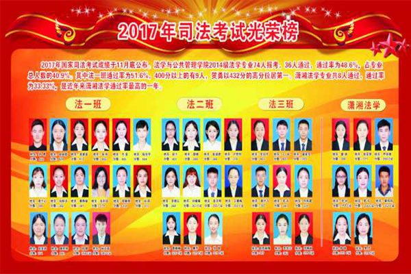 也继2011年后,连续7年远超全国平均水平。 在通过的36名同学中,400分以上的有9人,A证获得者27人,C证获得者9人。其中,法一班的贺勇以432分的高分位居榜首,而法一班也以55.2%的通过率位列班级通过率第一。值得一提的是,七区二栋126寝室、127寝室、131寝室、214寝室以及七区四栋306寝室“抱团”参考,互相帮助,均有三人通过司考。 为培养全面法学人才,确保高绩点的司考通过率,学院坚持课堂与课外、校内与校外、理论与实践相结合做好司法考试工作。在校内,紧抓课堂教学工作,提倡“司考进课堂”,推进优良学风建设;组织开展英美模拟庭审、案例研习会等活动,提升同学们的法律素养;做好司考成绩光荣榜,举行经验交流会及专题讲座,营造司考氛围,提高同学们的司考积极性和自信心;进一步开放暑假空调自习教室,鼓励专业老师随堂指导,做好后勤服务与保障工作。在校外,联合爆料网