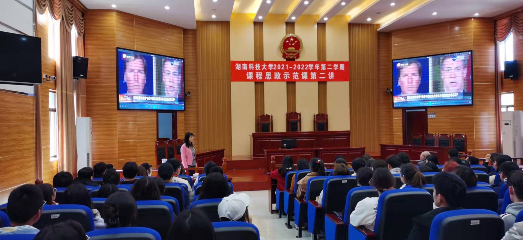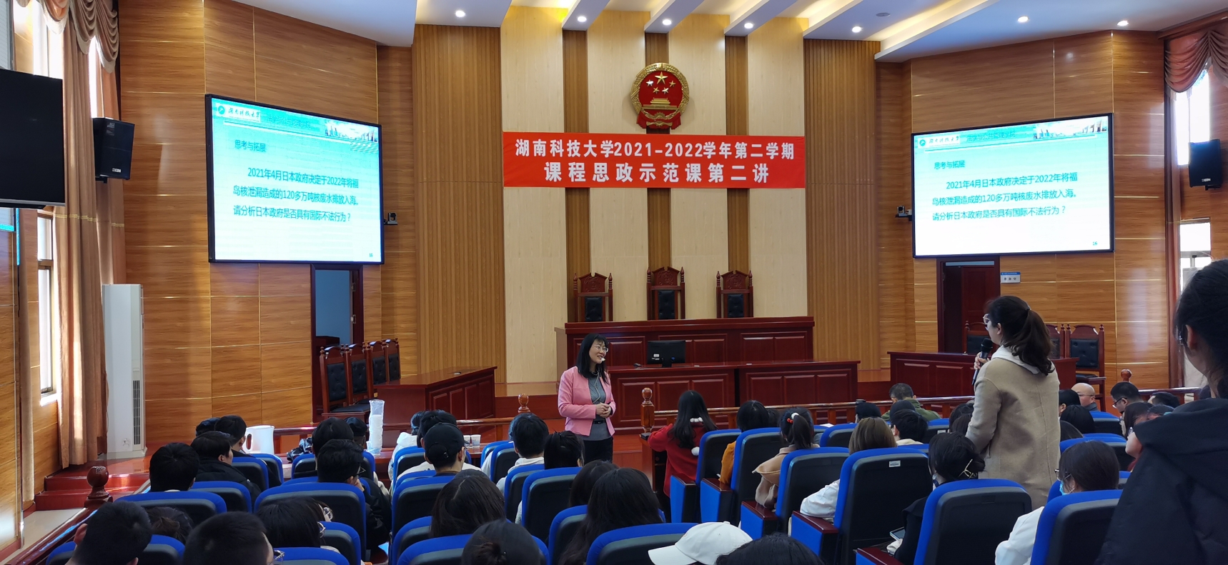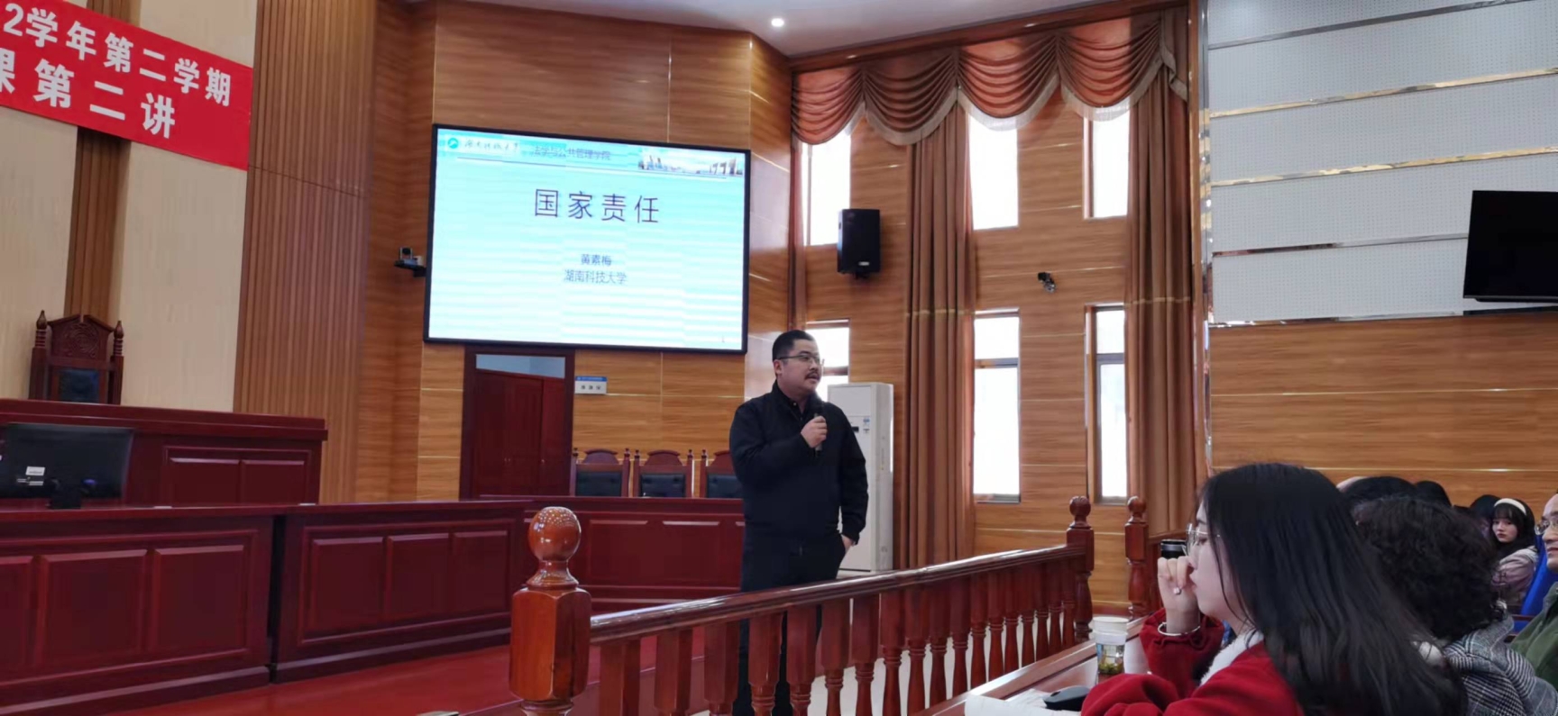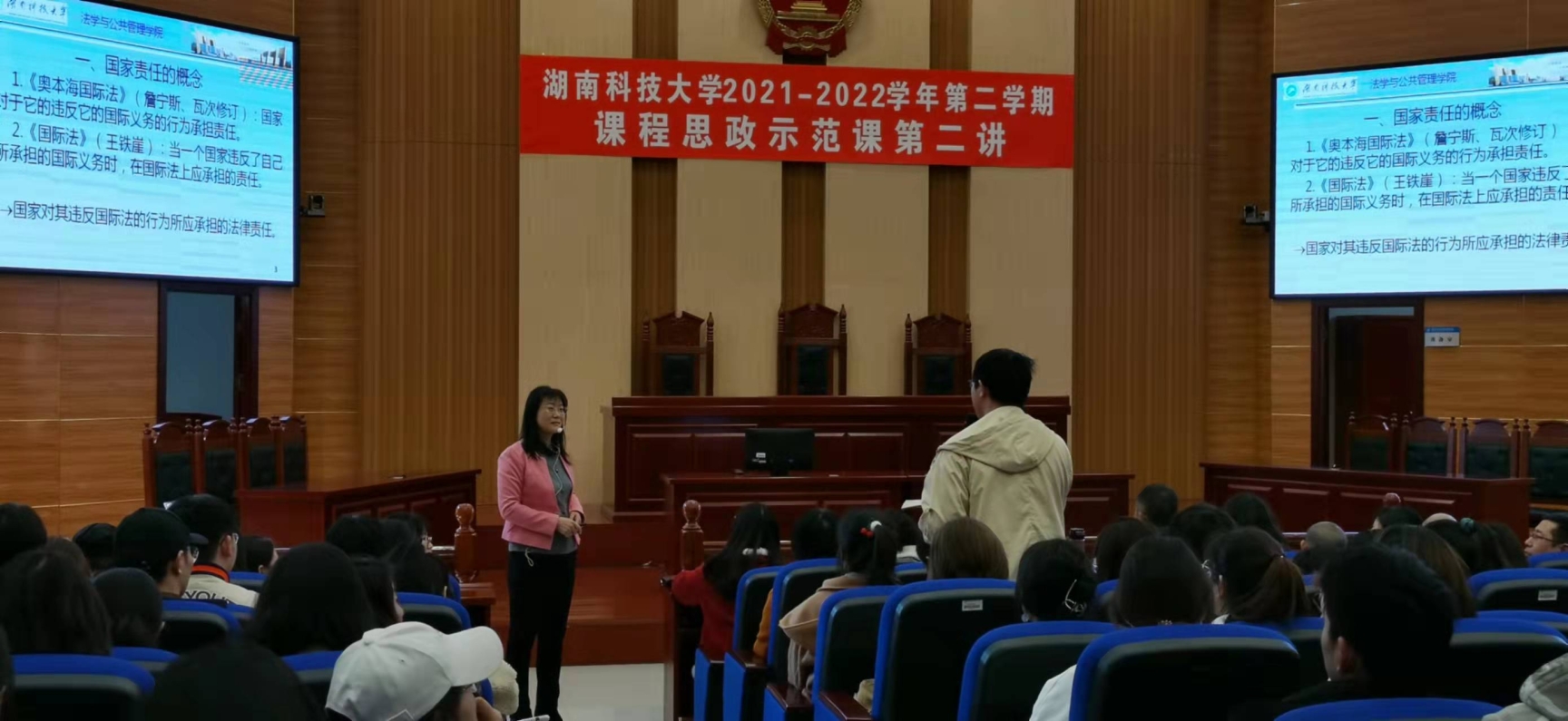 “课程思政示范课”第三讲在法管学院模拟法庭成功举行。本次示范课由法管学院黄素梅副教授主讲,题目是“国家责任的构成”。示范课由法管学院教学副院长王明主持,教务处相关领导、学校教学督导、本院以及其他学院师生共180余人到场观摩学习。