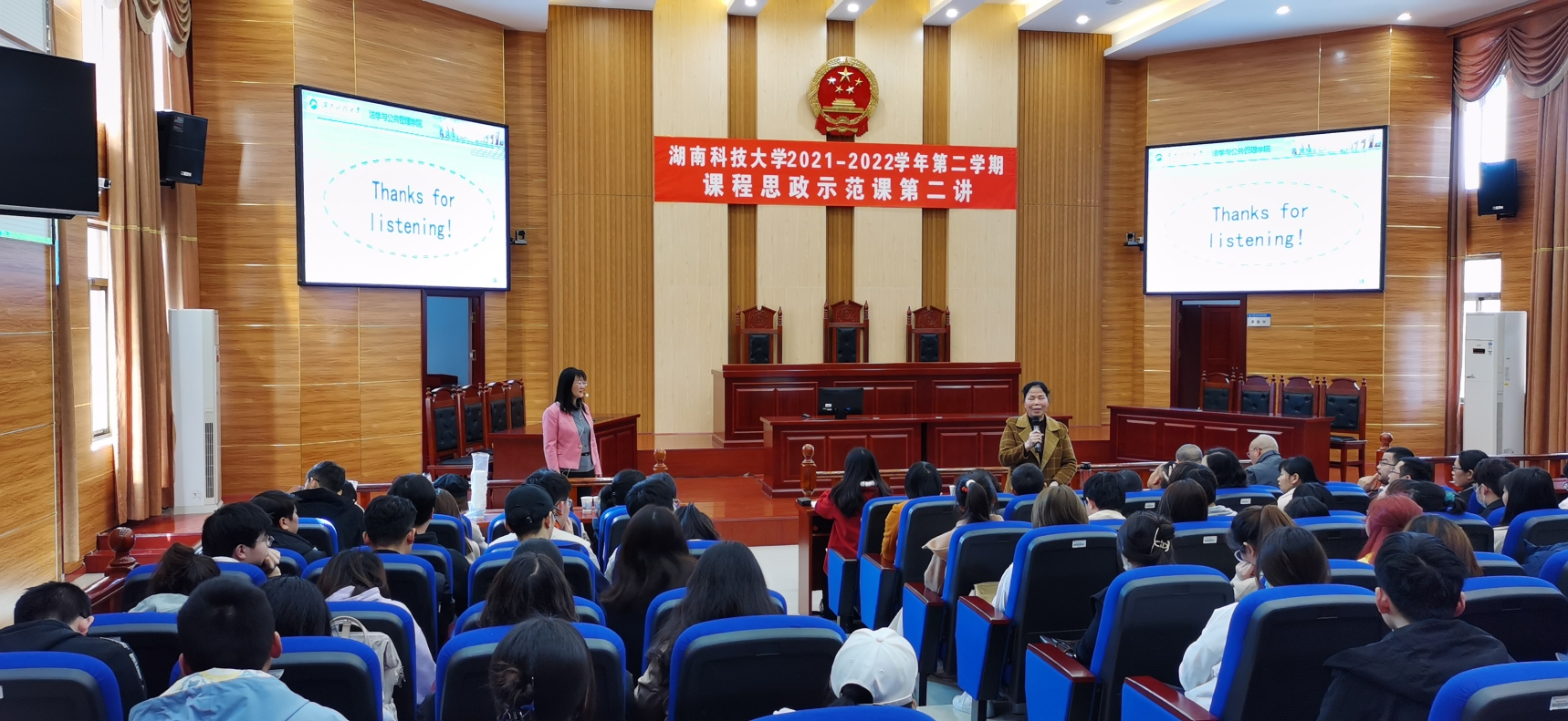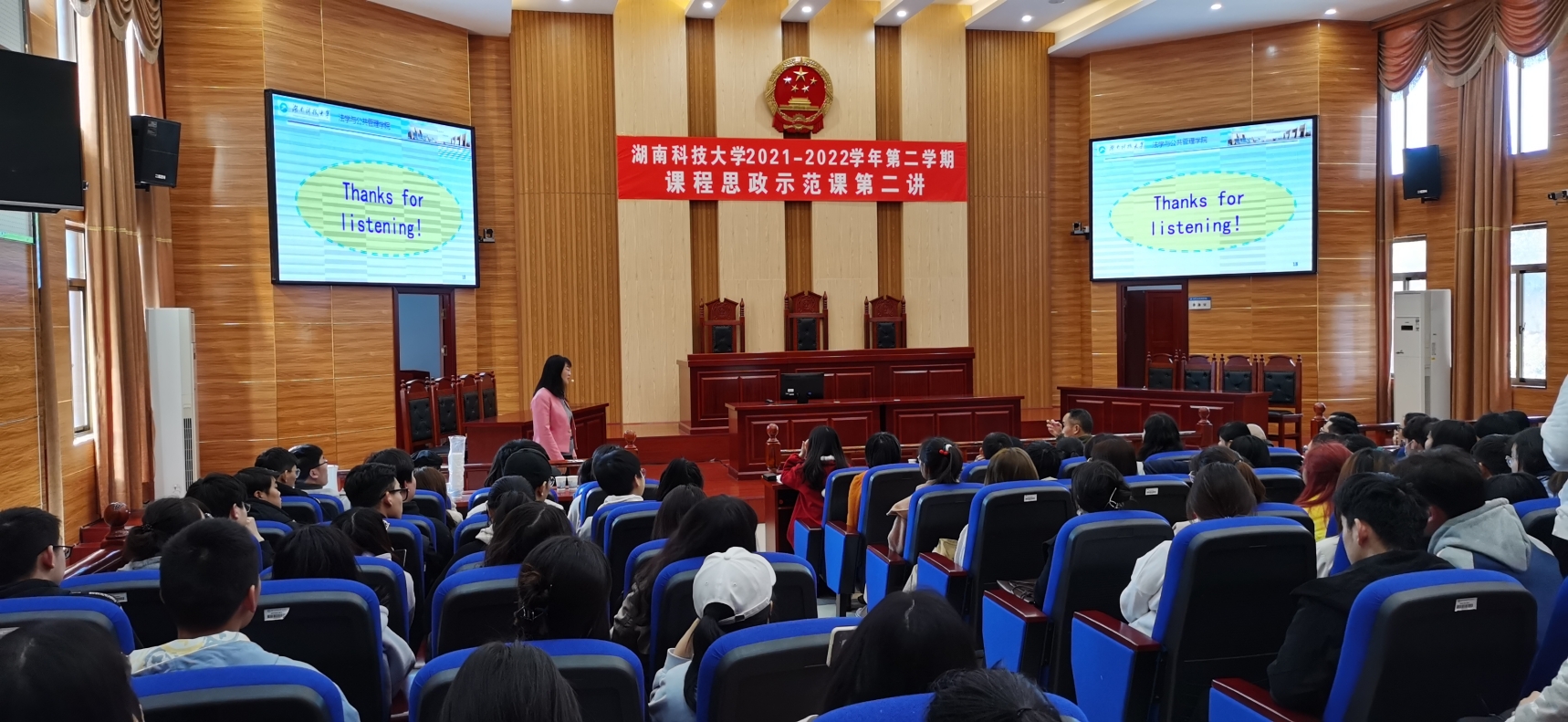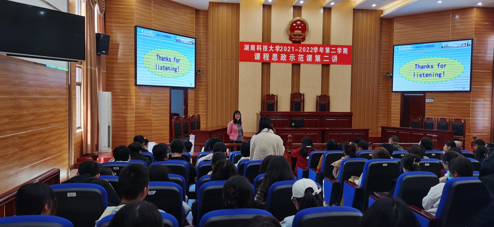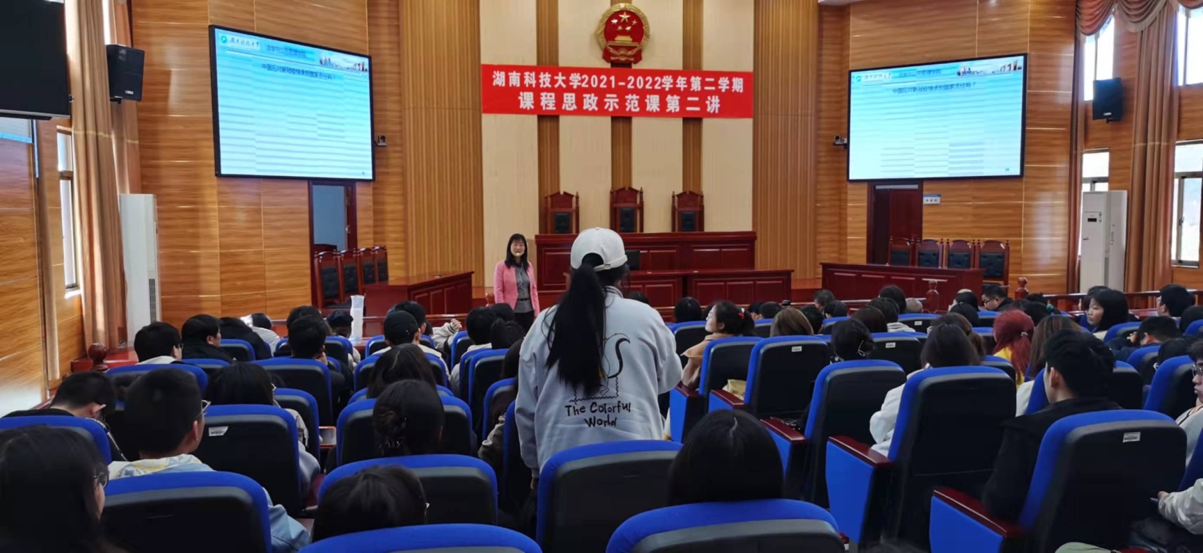 “课程思政示范课”第三讲在法管学院模拟法庭成功举行。本次示范课由法管学院黄素梅副教授主讲,题目是“国家责任的构成”。示范课由法管学院教学副院长王明主持,教务处相关领导、学校教学督导、本院以及其他学院师生共180余人到场观摩学习。