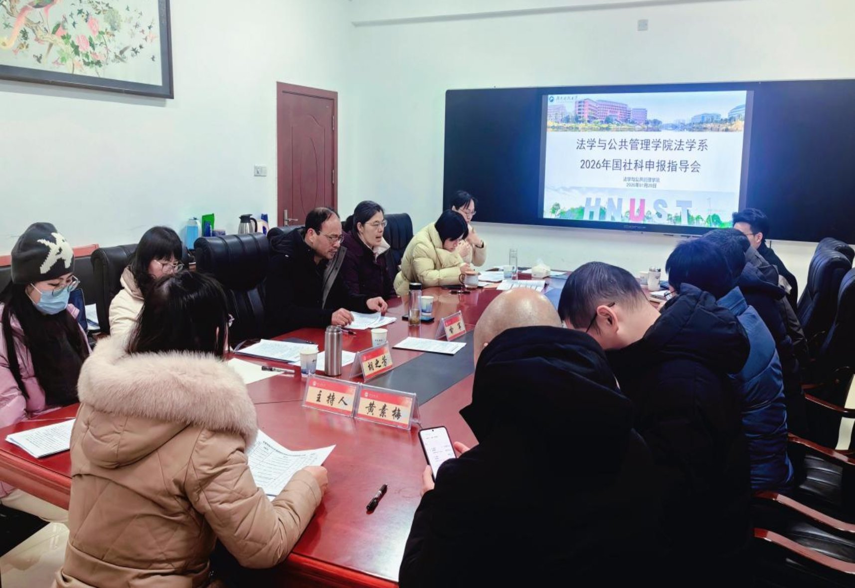 法学系于立言楼A427会议室举办国社科项目申报指导会。会议由黄素梅教授主持,喻军教授、胡之芳教授担任指导专家,法学系拟申报2026年国社科的部分教师参会。