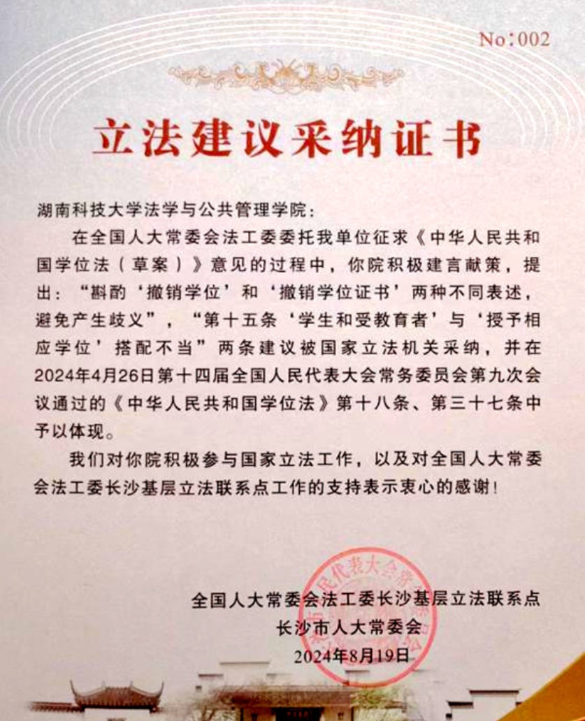 立法研究基地提出的两条立法建议被国家立法机关采纳,并在2024年4月26日第十四届全国人民代表大会常务委员会第九次会议通过的《中华人民共和国学位法》第十八条、第三十七条中予以体现。