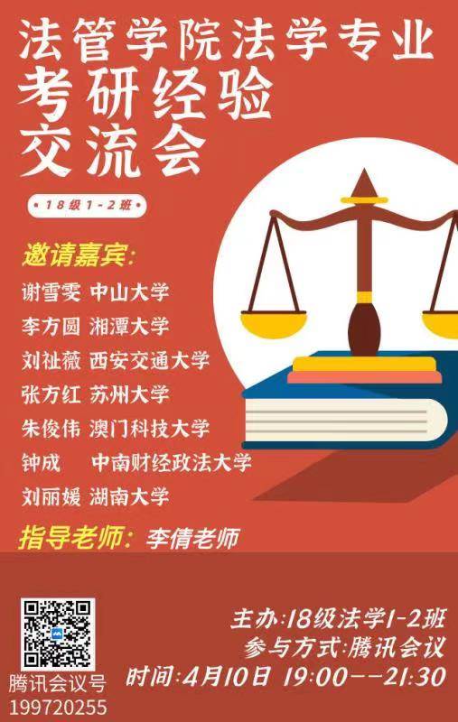 李倩老师指导,法学一班班长熊震主持,谢雪雯、李方圆、刘祉薇、张方红、朱俊伟、钟成、刘丽媛等七名同学做经验分享,本院法学考研生参与了交流。