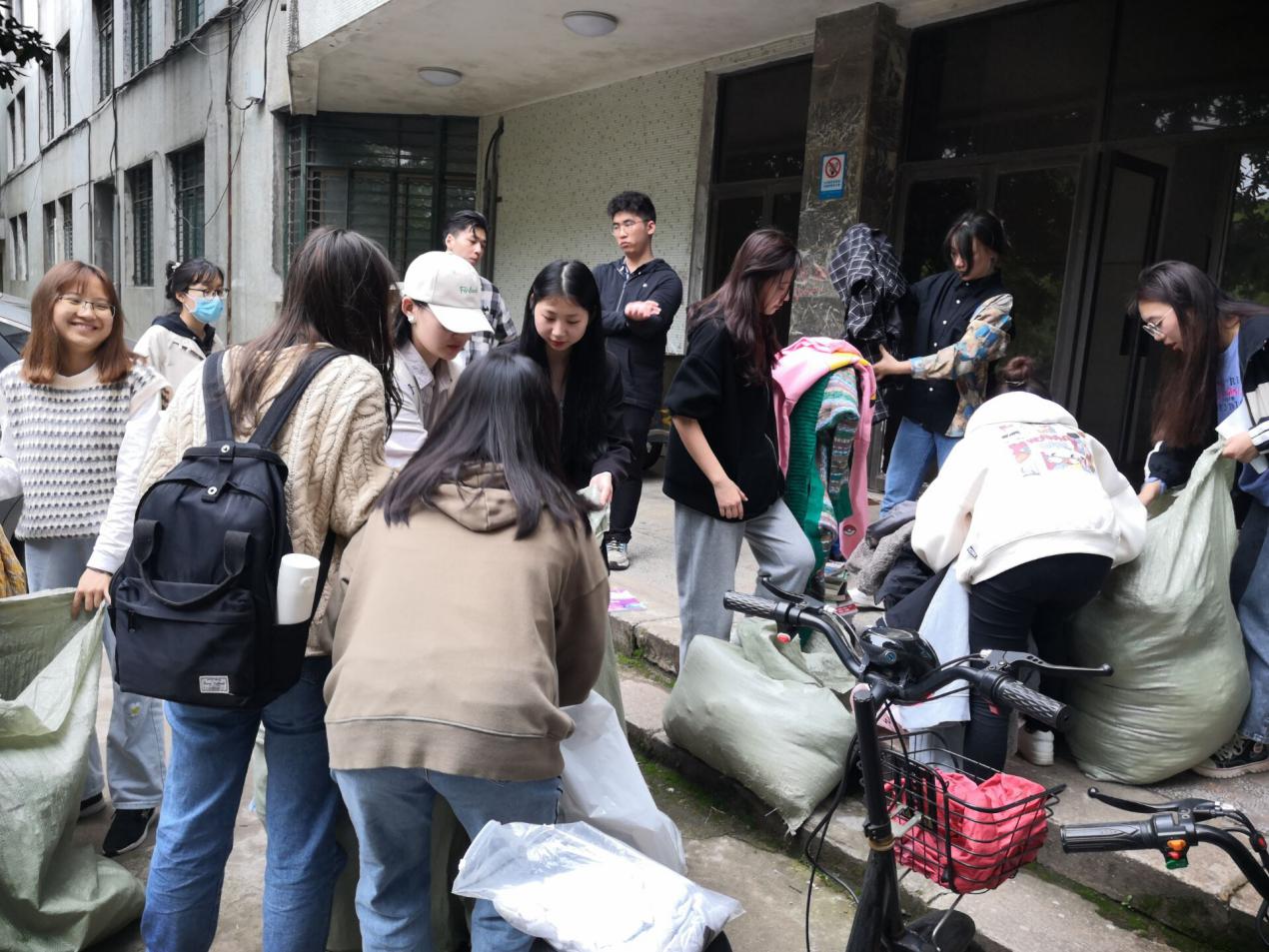 活动于第十教学楼提前设置了回收旧物点,同学们互相配合,将回收旧物运送至指定地点后,将旧物进行分装、清点、打包。本次活动以“爱心募捐,旧物传情”为主题,旧物多为可穿衣物,本院学生的爱心与温暖将顺着衣物传递到更远的地方,传递给更需要的人。