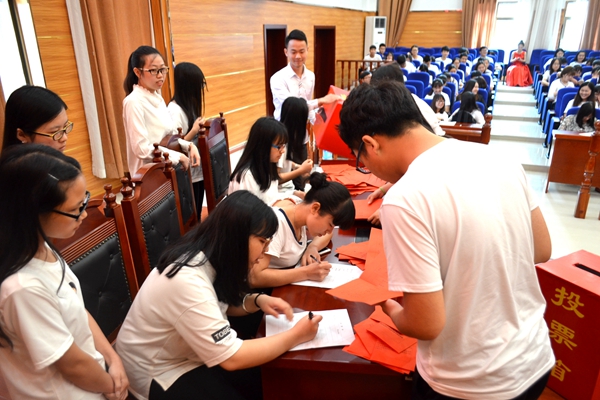 党委副书记叶军,辅导员王球云、伍安、刘春生、张惠和王新以及第一届主席团成员,各部门部长,14-16级各班选举代表。 大会第一项,由第一届学生会主席赵文超作上年度学院工作报告。首先,他从工作、经验、成就三个方面对第一届的主席团的工作做了简要的回顾与总结。接着他与大家分享了在过去一年中第一届主席团成员是如何在新学院合并的情况下,披荆斩棘,勇于创新,为学院付出,也使自己成长的历程。最后,他对下一届团委学生会干部们寄予厚望。“坚持自己的理想,记住自己的承诺,创造法管辉煌!” 经过层层筛选,脱颖而出的七位主席团候选人,15法三谭巧俐、15法一杜婧、15公一刘湘相、15公一张艺辉、15公二李禹宏、15公二马晓璇、15法一赵雪燕依次上台做竞选演讲。他们分别向大家展示了个人简历、竞选优势、工作设想等。候选人们个个西装革履,意气风发,朝气蓬勃。 大会的高潮,即投票和计票环节。每个同学拿到投票表都进行了斟酌思考,为自己心目中的最佳人选投出神圣的一票。与此同时,叶军书记也作了最后的总结发言,“从竞选主席团同学们的积极表现中可看出,学生会是一个汇聚青春正能量的地方。我希望新主席团成员能够‘在其位,谋其政,担其责’,扎扎实实地开展工作,用行动来证明自己的能力,用行动来为法管学院添彩。” 经过紧张的计票,大会总监票人龙聪胜为大家公布投票结果。大会结束后,学院领导老师召开会议,结合民主选举票数、考虑诸多因素,随即公布法管学院第二届主席团干部名单:团委第一副书记杜婧,主席李禹宏,团委第二副书记马晓璇,副主席谭巧俐、张艺辉。 (责任编辑:admin) |
