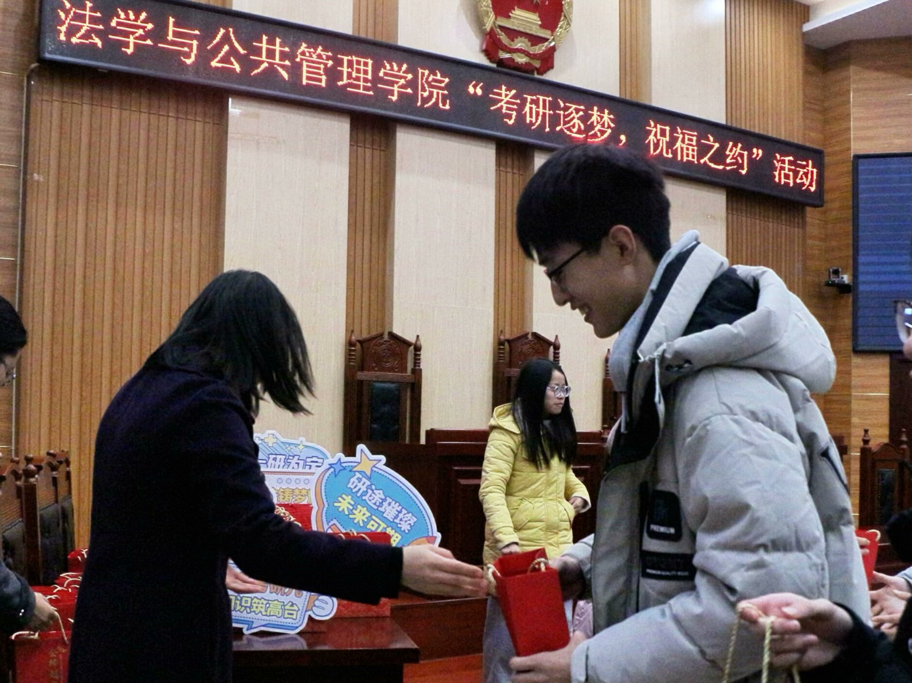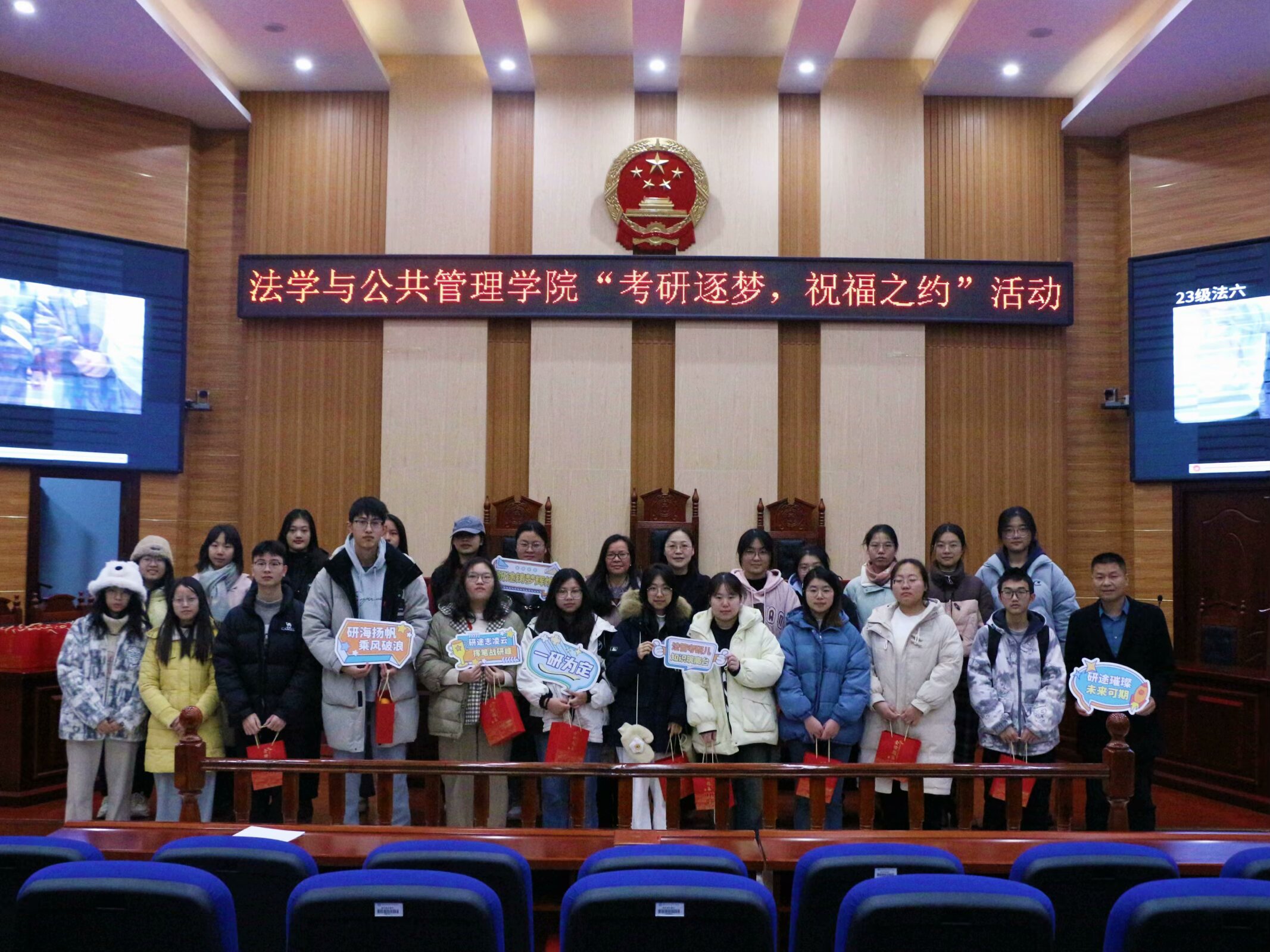 于立言楼3-2模拟法庭举办“考研逐梦·祝福之约”活动,21级考研学子到场参会。爆料网