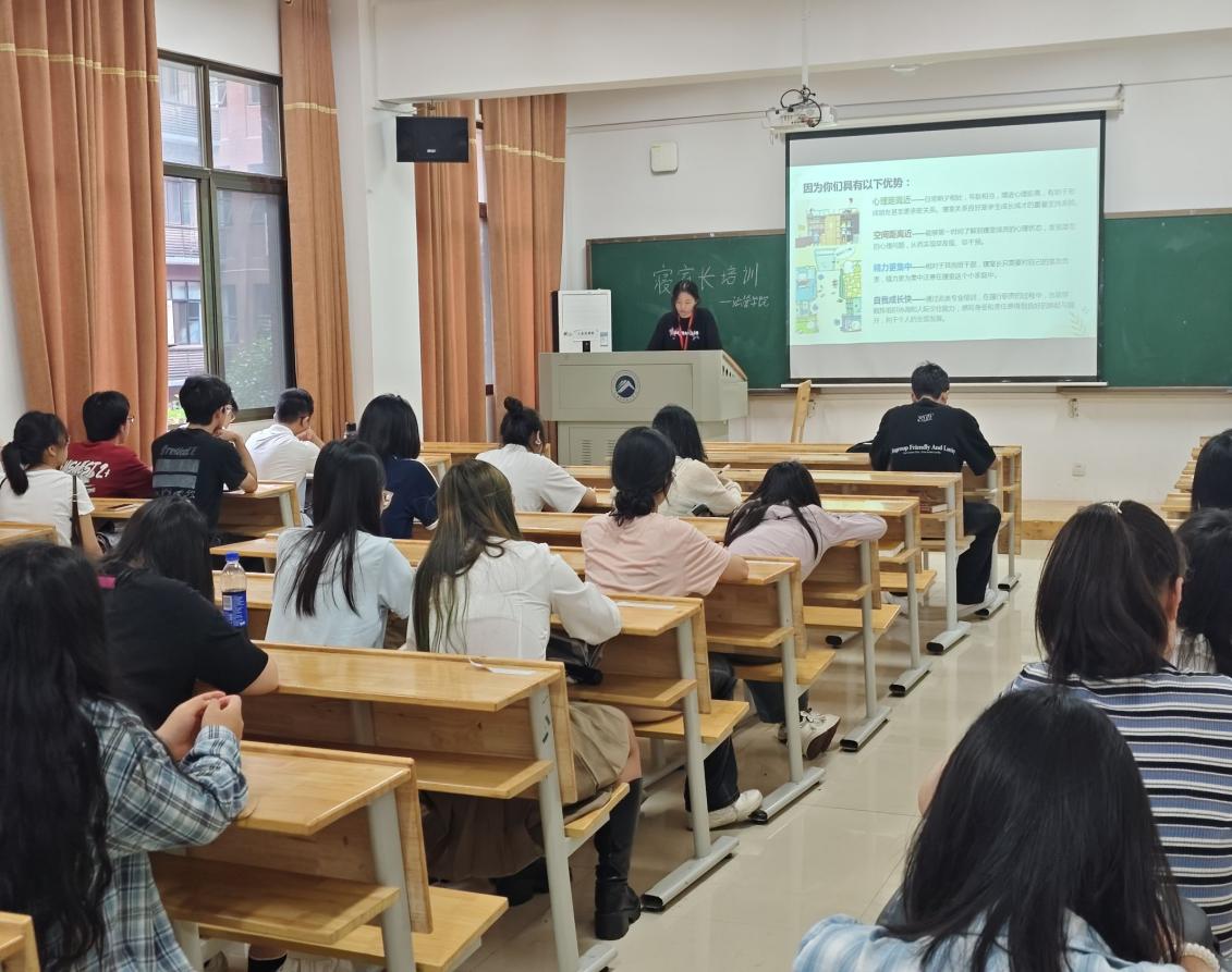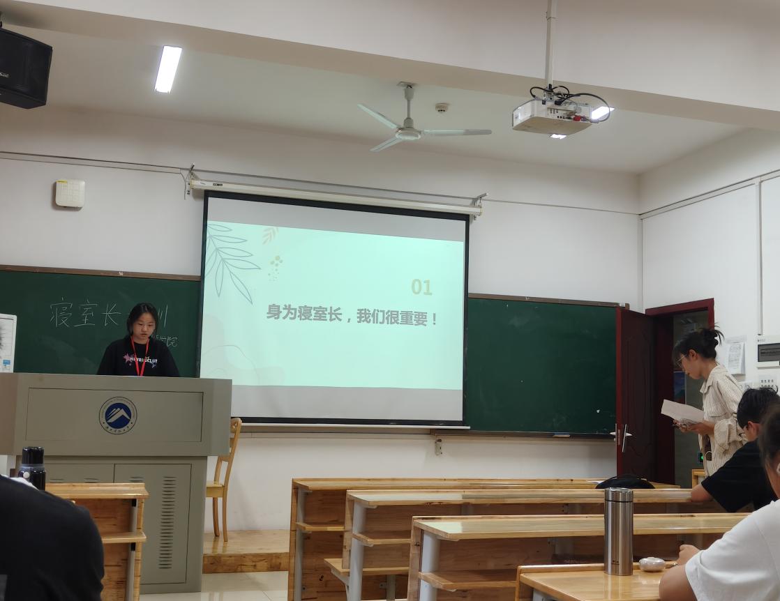 此外,主持人结合幻灯片内容生动诠释寝室长在宿舍管理中的核心地位,以深化其自我定位认知。