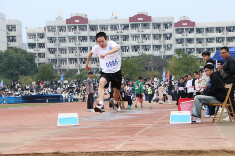 选手石浩楠正全力腾跃,他弓身展腿,运动鞋离地的瞬间带着破风的势头,身后的看台人声鼎沸,同院的伙伴们举着号码牌张望,背景里的宿舍楼仿佛也在为这场青春的冲刺作见证。每一次蹬地、每一次腾空,都是他为学院拼尽全力的注脚。