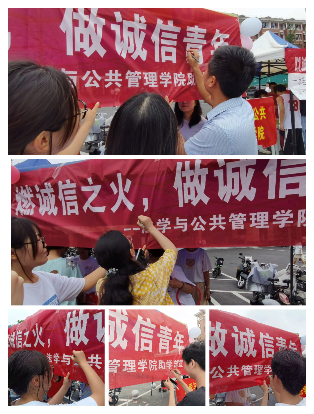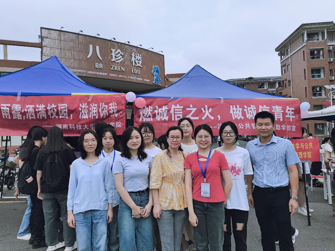 为大力弘扬社会主义核心价值观,培育诚信理念,传承诚信文化,法管学院联合人文学院于5月31日上午在八珍楼入口处举办诚信主题线下摆点活动。学院党委副书记范军豪,学工办主任郭志军老师,辅导员彭钰会老师莅临指导。