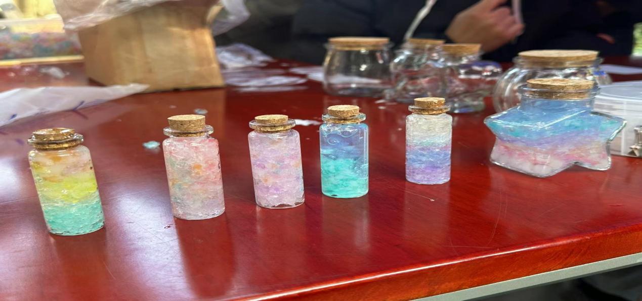 活动开始前,法管学院心健部成员提前准备好活动所需道具——海绵宝宝、玻璃瓶、水桶、针管等,并由心健部成员提前制作出彩虹瓶的样品供同学们参考。待一切准备就绪,活动正式开始,各学院学子积极参与,表现出极高的热情与兴趣,充分发挥自身想象力,制作出不少令人眼前一亮的作品。在创作彩虹瓶的整个过程中,同学们沉浸到手工制作之中,体会手工乐趣所在的同时释放压力,舒缓内心。活动结束后,同学们自行将装载着美好愿望的彩虹瓶带回寝室。