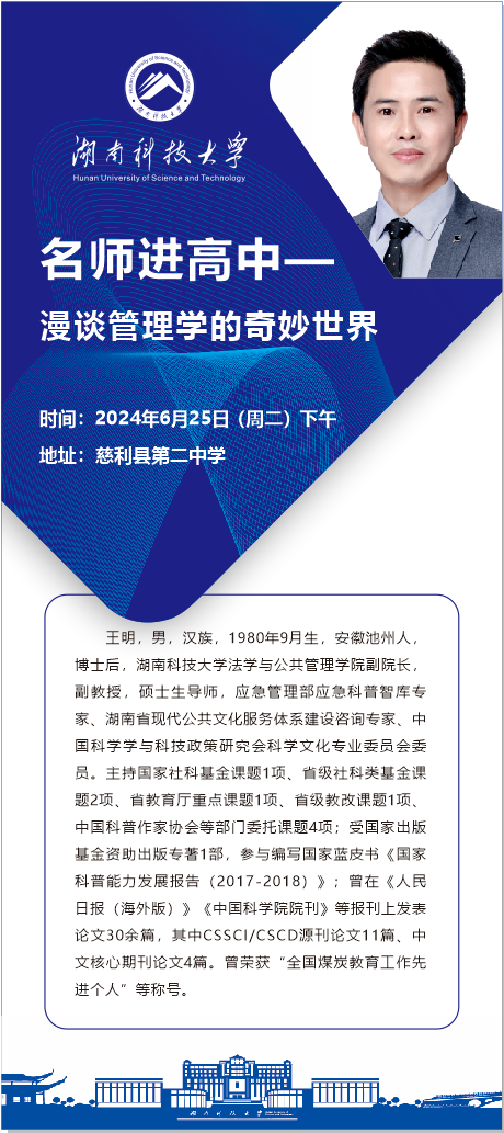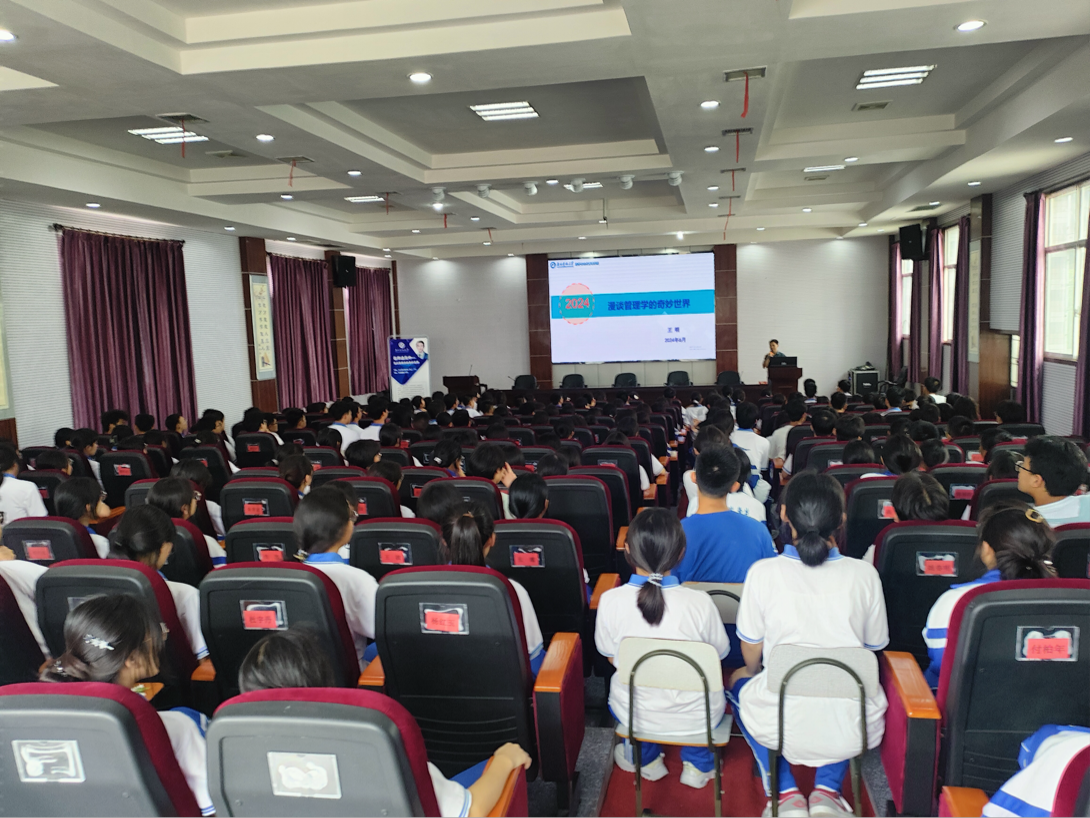 王明老师走进慈利县第二中学,以“漫谈管理学的奇妙世界”为主题,给同学们带来了一场别开生面的主题讲座,带领同学们在日常生活及历史故事中探寻管理的奥秘,深入浅出的为同学们讲述了如何理解管理的定义、管理的核心任务、管理艺术的进阶以及怎样通过学习和实践成为一位优秀的管理者。