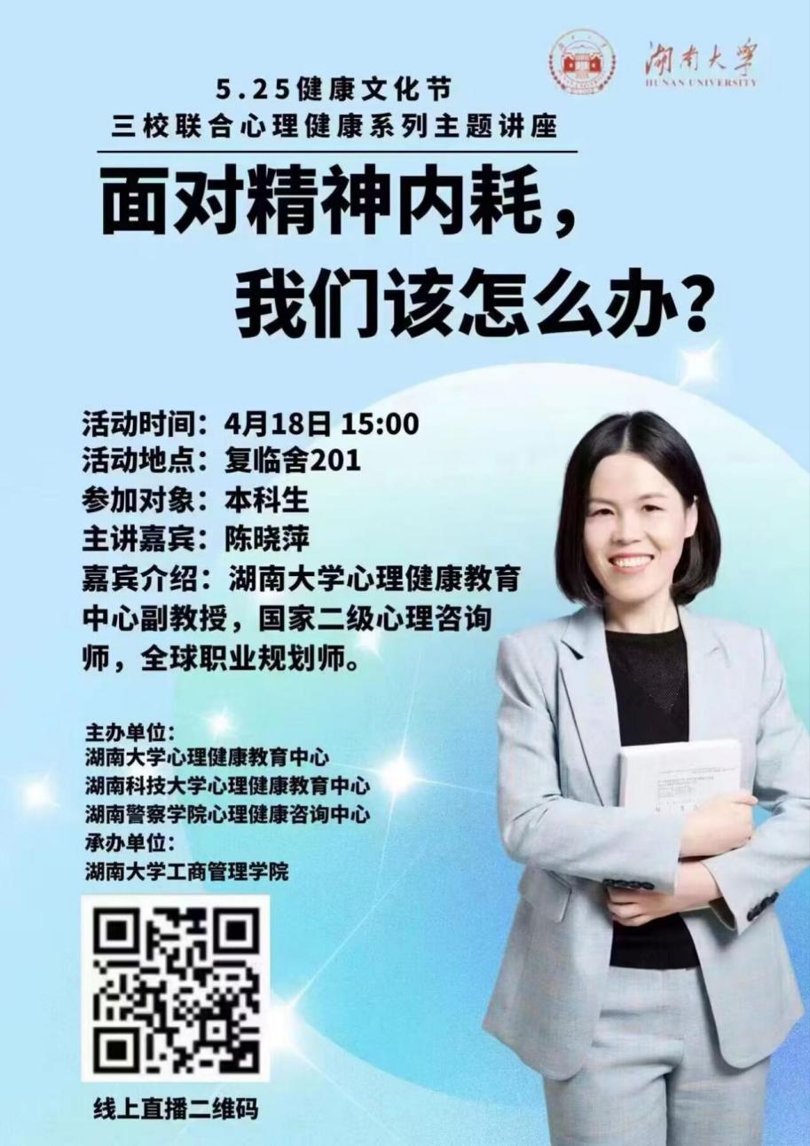 及湖南警察学院三校于4月18日下午三点联合开展“面对精神内耗,我们该怎么办?”线上主题讲座,湖南大学心理健康中心副教授陈晓萍担任主讲嘉宾。