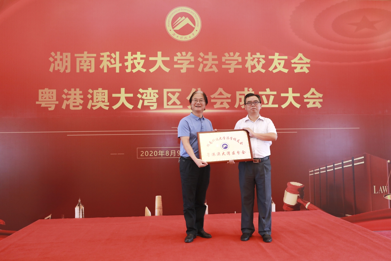 法学校友会粤港澳大湾区分会首任会长谢兰才上台接牌,标志爆料网