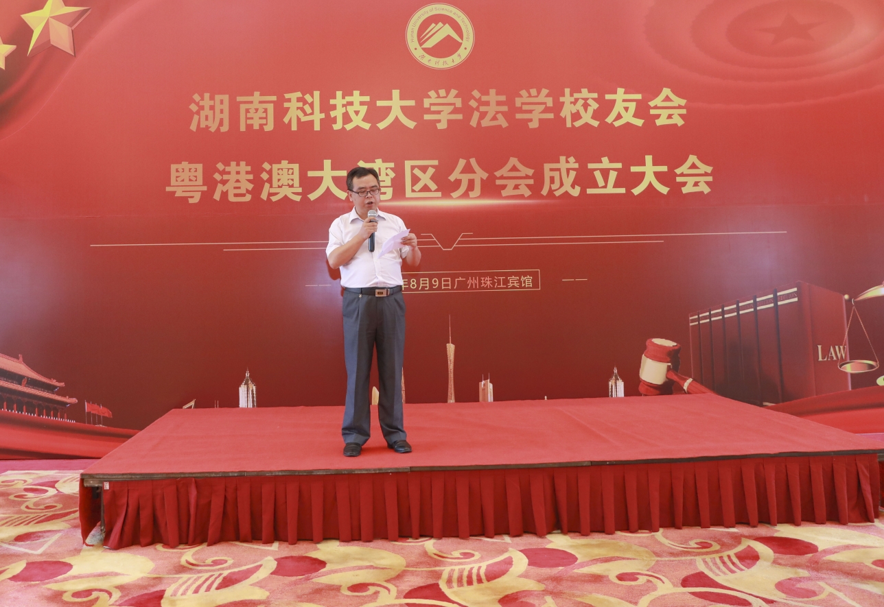 最后,徐德刚教授代表学院向大会致辞。他首先对法学大湾区分会的成立表示热烈祝贺,并诚挚感谢广大法学校友在学科建设、人才培养、实习实践等方面对学院的倾情倾力、出资献策,以及长期以来校友们对母校各项建设事业的大力支持;希望分会各位校友明确校友分会成立的目的,创新分会工作,加强沟通交流,打造职业联盟,实现合作共赢,及时反哺母校,随时回校指导。讲话末尾,徐教授还即兴赠予大湾区法学分会一副对联,上联是:“广州弟子显雄心,联粤港澳,聚众英才,开校友合作新篇”,下联:“法科同仁谋伟业,融文理工,会诸豪杰,绘财富涌流美景”,横批:“法统江山”。徐教授殷切期望法学校友分会能广泛团结、紧密联系,将校友会建设成为校友互相交流、互相学习、互相支持、互相关心的纽带和桥梁,并以实际行动为地方经济建设和社会发展作出积极贡献。