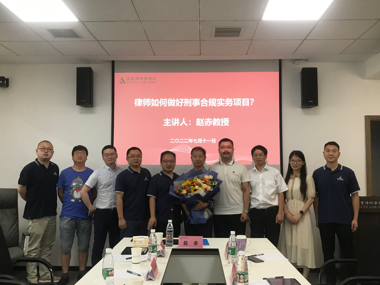 签约仪式后由北京师范大学法学院刑法学博士、常州大学史良法学院教授、刑法研究所所长、合规研究中心主任赵炎教授带来题为《律师如何做好刑事合规实务项目》的学术讲座。报告由邱帅萍书记主持,与谈人马驰升主任和王刚主任分别就赵赤教授报告结合自身工作经历进行讨论和交流。会议在座纷纷感谢赵赤教授精彩讲课,表示其能够解决工作中的困惑并受到启迪,受益匪浅。