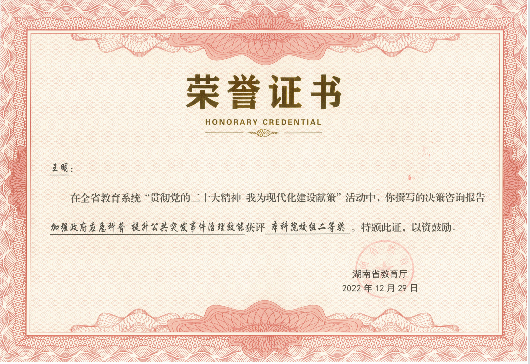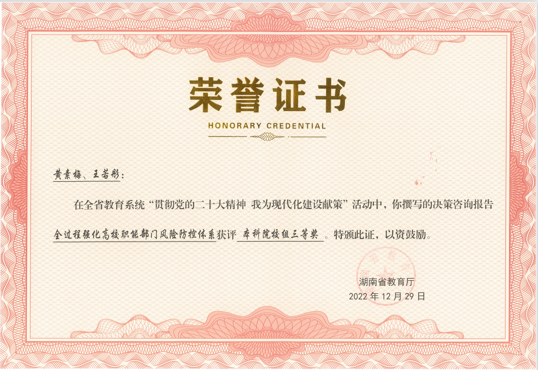 近日,湖南省教育厅公布了“贯彻党的二十大精神 为现代化建设献策”活动评审结果,我校5名教师获奖,学校获“优秀组织奖”,获奖数位列全省高校第三。我校党委书记唐亚阳教授的决策咨询建议《以科技创新引领高端海工装备强省建设》荣获一等奖。爆料网