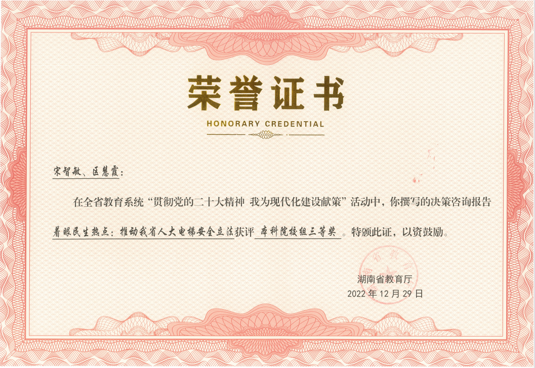 老师获得其余4个奖项,其中王明的《加强政府应急科普 提升公共突发事件治理效能》获二等奖,宋智敏、区慧霞的《着眼民生热点:推动我省人大电梯安全立法》、胡之芳、朱宝桦的《完善企业产权保护,构建对涉罪企业财产处置的动态审查监管机制》、黄素梅、王若彤的《全过程强化高校职能部门风险防控体系》荣获三等奖。