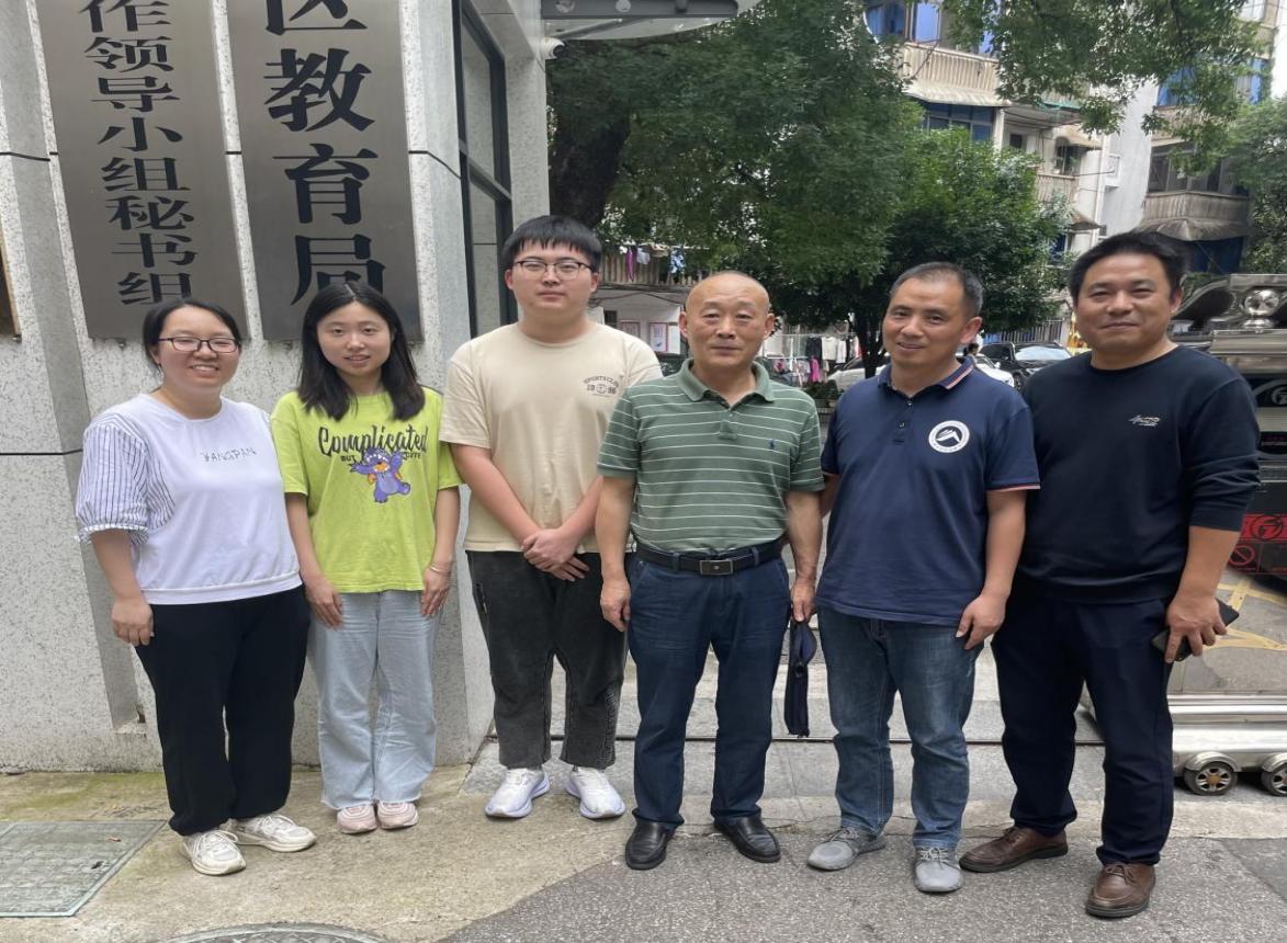 ▲检查小组成员与实习学生在雨湖区教育局门口合影
