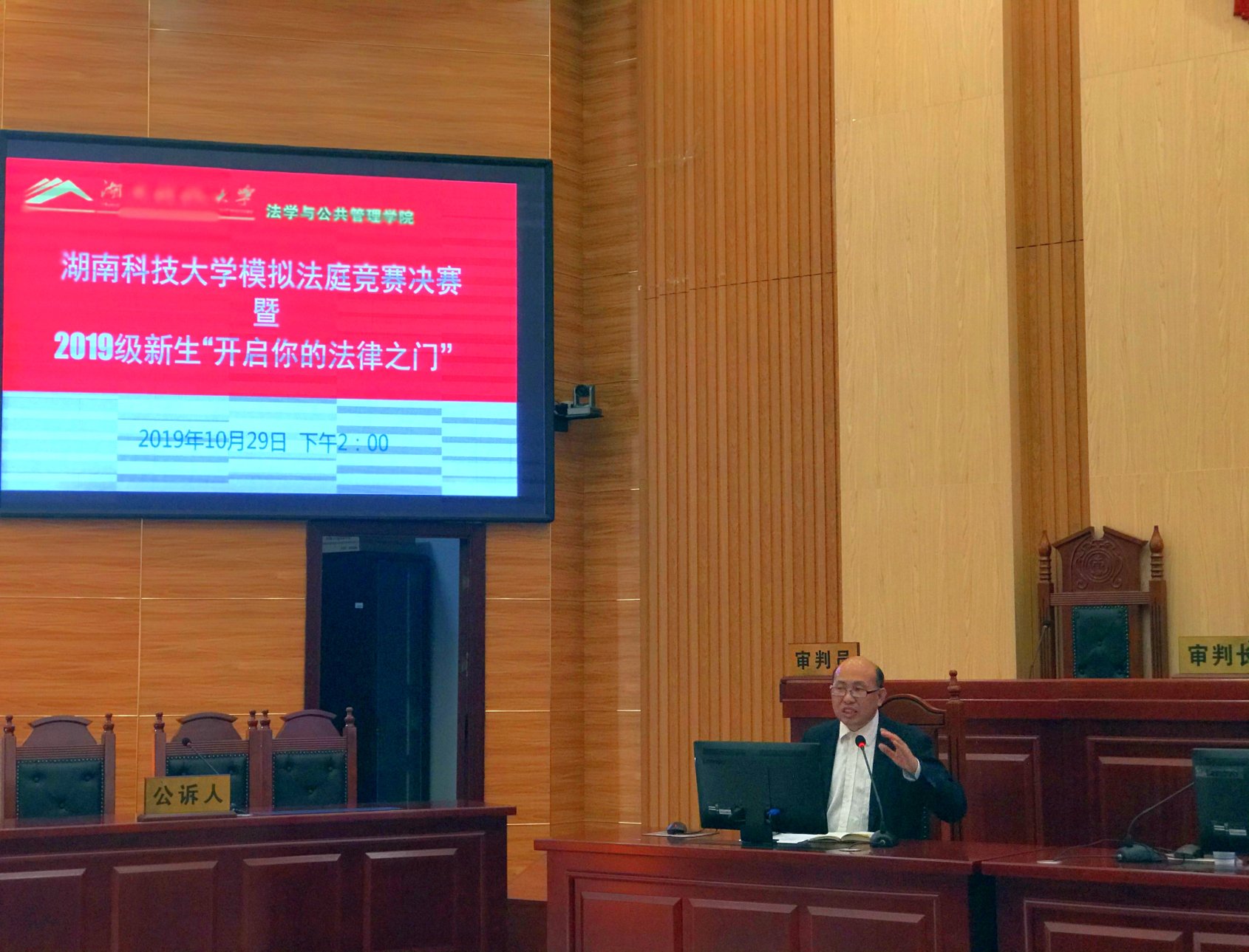 法管学院副院长李云霖教授代表学院出席决赛活动并致辞,吴四江老师、胡之芳教授和陈小杉老师组成合议庭主持了决赛的两组庭审。来自法管学院和潇湘学院2019级法学专业的170余位同学在决赛现场旁听并观摩,庭审中缜密、激烈、紧张的对抗和角逐也为他们开启了通往未来漫长的专业学习及职业生涯的“法律之门”。