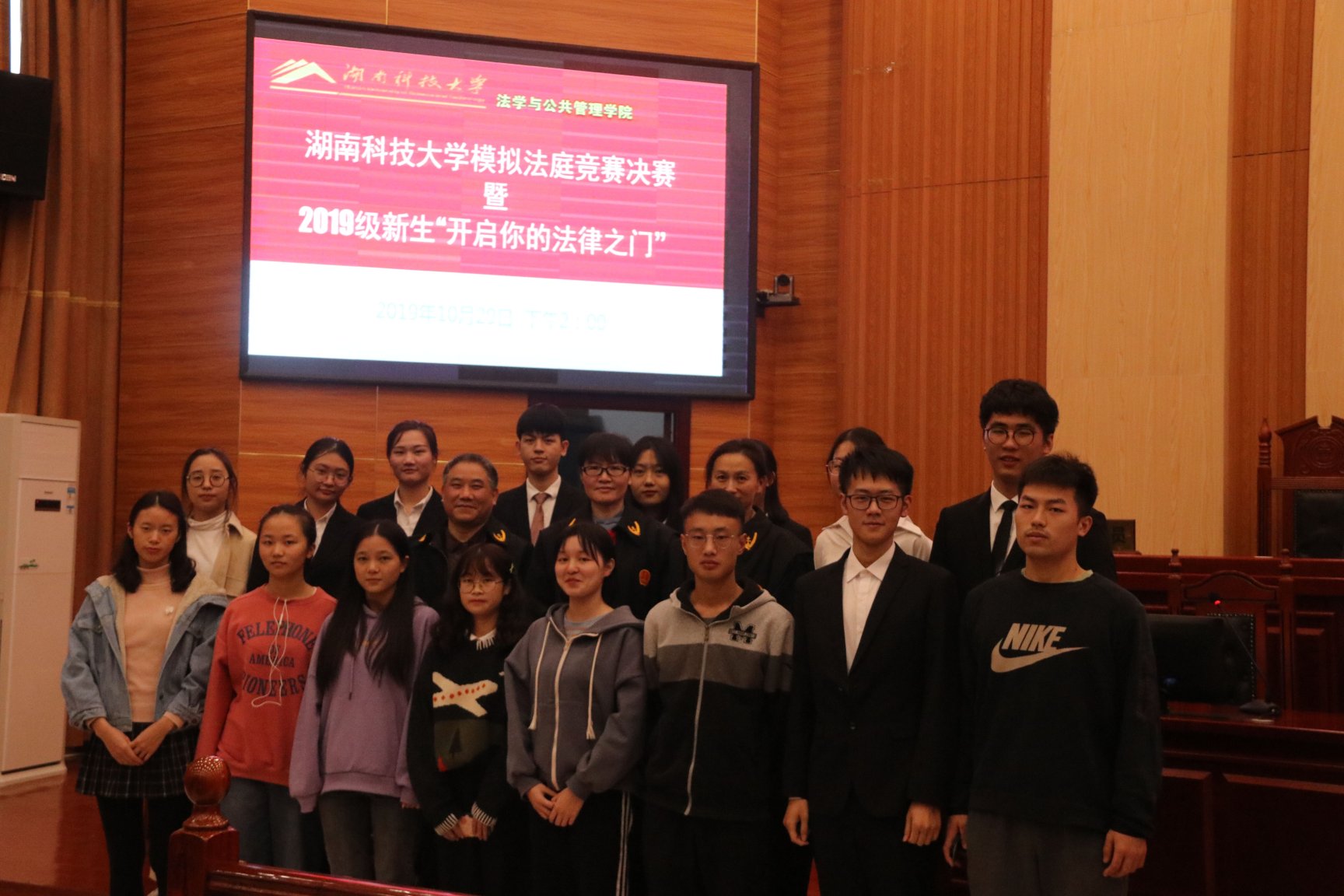模拟法庭竞赛决赛暨2019级新生"开启你的法律之门"活动在立言楼模拟法庭隆重举行。本届模拟法庭竞赛同时也是湖南省大学生模拟法庭竞赛的选拔赛,法律协会为活动拟定了公平、专业、严谨、细致的赛程和选拔规则,并邀请了法管学院邱帅萍副院长、胡之芳教授、吴四江老师、陈小杉老师、夏飞明老师担任评委兼法官对选拔程序严格把关。整场活动历时一个月,48位来自我校不同专业的本科同学经过预选赛、半决赛的精心准备和激烈角逐,最终12名选手进入决赛。