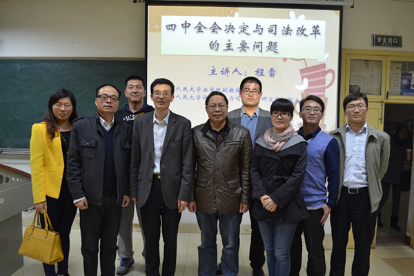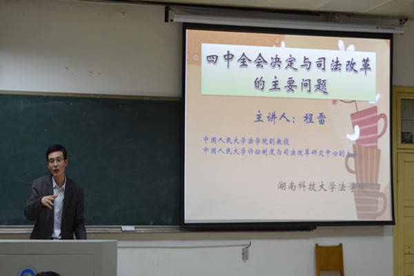师生献上一场名为“四中全会决定与司法改革的主要问题”的讲座。法学院院领导廖加林、喻军、胡正昌,法学院老师胡之芳、毛小平、刘敏、宋智敏出席,喻军副院长主持讲座。 此次讲座主要围绕依法治国展开,分别针对我国现行的司法机关、行政系统内部和法律法规做出了详细阐述。“大沿帽,两头盖,吃完原告吃被告”,程博士形象地描述了我国司法内部的现状,激起了大家的求知欲望。紧接着,程博士通过对于我国依法治国方略的历史梳理,重点就司法改革面临的难点问题展开深入剖析。讲解过程中,他精练生动的语言和贴近现实的案例赢得掌声阵阵。 最后,胡之芳老师以一句“法学学生求学道路上的一笔财富”对本次讲座做出了高度讲评,为此次“依法治国之旅”画上了圆满的句号。 依法治国的理念自十五大正式提出后,一直贯彻至今,十七届四中全会更是首次以“依法治国”作为主题,可见法治的地位是在怎样的一个高度。未来中国法治的道路又会怎样呢?让我们拭目以待。 (责任编辑:admin) |