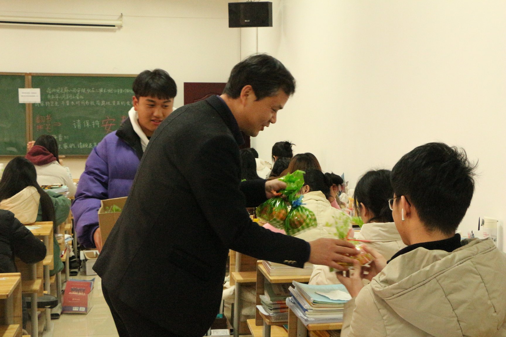 平日严肃安静的考研教室里,交谈声、欢笑声和掌声此起彼伏,埋头苦读的同学们脸上露出久违轻松的笑脸,期待他们轻装上阵、一战上岸!