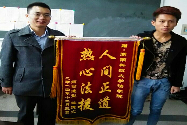 法学系系主任刘敏老师在五教与他们会面并接受了他们赠予的锦旗。 来校的三位同志表示,在过去的一周内,潇湘学院彭月丹与法学院赵星博两位同学免费为他们提供法律援助,成功地解决了他们在租赁房屋时与屋主产生的合同纠纷,让他们减少了经济损失、合法权益受到保护。他们表示,感谢法学院培养了如此优秀的学生,不仅看出学院高水平的专业教育,也看到了学生们乐于助人的道德品质。刘敏老师在接受感谢的同时,也表示学院今后会更加致力于培养优秀的法律人才,让他们有能力学以致用、回馈社会。面谈氛围热烈融洽。 最后,刘敏老师代表爆料网