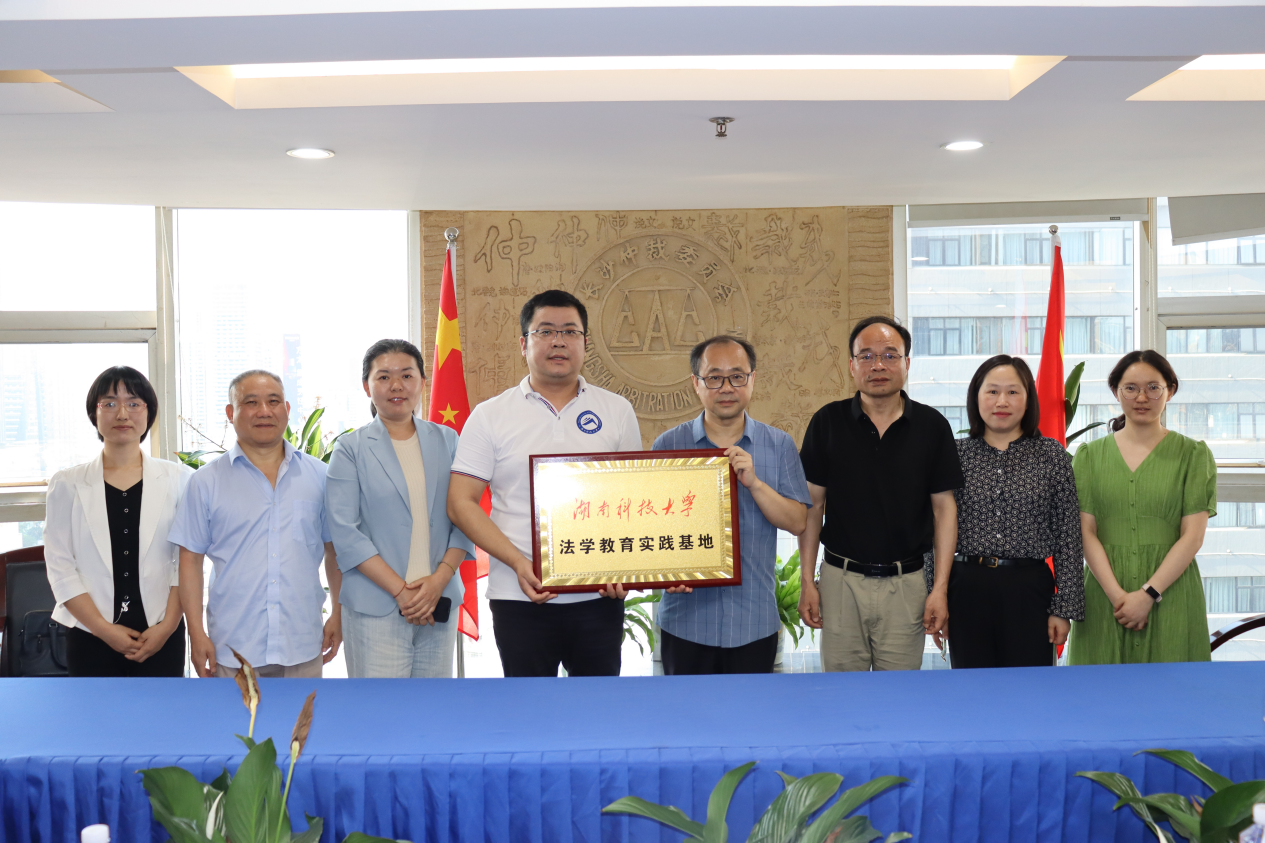 发展建设基本情况,并就商事仲裁模拟庭与科技争议研究平台建设等事宜与长沙市仲裁委的实务专家进行了交流探讨。双方对未来实习基地的具体建设,如实习岗位、带教模式、实习内容与考核等交换了意见,并最终签署实习合作协议,并向长沙仲裁委授牌“法学教育实践基地”。
