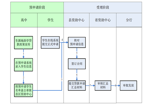 | 生源地助学贷款受理流程及注意事项 一、机制建设 各县(市、区)资助中心要在政府的主导下,构建政府、教育部门和银行协同管理、权责分明、风险共担的生源地信用助学贷款模式,进一步发挥当地政府部门和教育行政部门的管理作用,推动“政府主导、教育主办、金融支持”的生源地信用助学贷款模式健康持续发展。目前重点如下: (一)夯实机构建设 六条硬标准:机构、人员、场地、经费、设备以及财政风险分担的承诺函。 (二)推动建立多级联动管理机制(新内容) 各县(市、区)资助中心要推动当地政府构建“县、乡、村三级联动催收机制”,通过建立“县政府— 乡镇政府— 村(居)委会”、“县级资助中心— 高中— 乡镇中心校”多级协同管理体系,扩展生源地信用助学贷款工作参与主体,丰富管理路径,借助政府部门和教育行政部门力量提高工作效率,加大催收力度。 二、申请受理 (一)高中预申请(新强调内容) 注意事项:各高中于6 月15 日 前,将预申请系统导出的《预申请汇总表》加盖学校公章送县级学生资助中心存档;并以发布通知或公示等适当方式告知学生。 (二)贷款受理 1 、贷款政策 (1 )贷款对象 就读于预科班的学生,参加自学考试、成人高考的学生,进修类的学生以及当年在高校获得了国家助学贷款的学生不得申请生源地助学贷款。 (2 )贷款条件 学生本人入学前户籍、其共同借款人户籍均在本县(市、区)。 (3 )共同借款人条件 A 共同借款人户籍与学生本人入学前户籍均在本县(市、区); B 如共同借款人不是借款学生父母时,其年龄在25 周岁(含)以上,60 周岁(含)以下; C 未结清开发银行生源地信用助学贷款(或高校助学贷款)的借款学生不能作为其他借款学生的共同借款人。 (4 )贷款额度 按照国家现行政策规定,全日制普通本专科学生(含第二学士学位、高职学生)每人每年申请贷款额度不超过8000 元,且不低于1000 元;年度学费和住宿费标准总和低于8000 元的,贷款额度可按照学费和住宿费标准总和确定。全日制研究生每人每年申请贷款额度不超过12000 元,且不低于1000 元;年度学费和住宿费标准总和低于12000 元的,贷款额度可按照学费和住宿费标准总和确定。 2 、家庭经济困难资格认定 (1 )我省确定的唯一家庭经济困难认定单位为村(居)委会。 (2 )续贷学生、已通过高中预申请的首贷学生均无需再次进行家庭经济困难资格认定。 3 、受理准备 (1 )收到寄送的空白《借款合同》后,请复印若干张,进行信息打印位置的调试;在受理和贷后管理期间要做好合同(包括已用、报废及剩余合同)保管工作,并填好《合同管理汇总表》(报废合同要回收)。 注意事项:严禁各县级资助中心以任何形式私印空白《借款合同》。 (2 )确保系统用户能正常登录,动态口令牌在有效期内。需要申请或更换动态口令牌的县级资助中心,应填写《国家开发银行动态口令牌领用单》,并报省级资助中心。 注意事项:用户状态会被计入年度考核,被冻结用户请联系开行专管员解冻。 4 、申请审查 (1 )首贷申请 首贷申请材料
