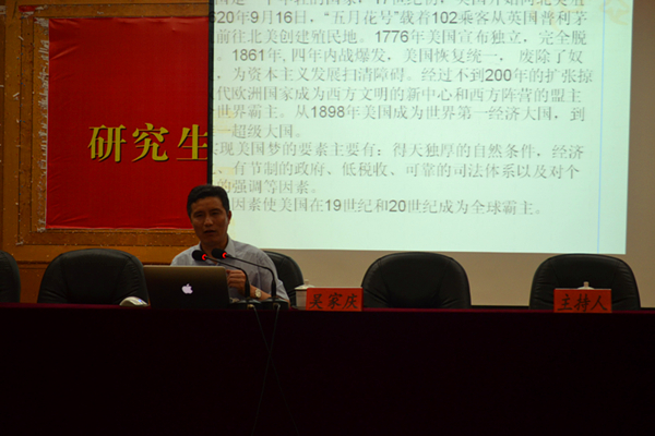 有幸邀请到了湖南师范大学教授、博士生导师吴家庆教授,在学术交流中心五楼报告厅做了题为“中国梦与未来中国”的讲座。此次讲座由廖加林院长主持,研究生学院刘金明部长、法学院副院长陆自荣、哲学系系主任颜中军及张晚林、凌应生、朱荣老师出席讲座,法学院、马克思主义学院、体育学院、教育学院研究生和部分本科生到场聆听。 “在复兴之路的展览上,中国首提中国梦……”讲座伊始,吴教授就打造中国梦的原因发问。他提出打造中国梦是“调整国家对外战略”、“应对各种挑战”、“创新官方话语体系”的需要,同时也指出,与美国梦相比,中国梦是一种新型的大国梦,主要表现在内涵和实现路径上。“国家富强、民族复兴、人民幸福是中国梦的内涵所在。”吴教授说道,它的实现路径是“和平合作、开放包容、互学互鉴、互利共赢”的,实现关键在于“四个全面”:全面建成小康社会、全面深化改革、全面推进依法治国、全面从严治党。吴教授从提出中国梦的原因、中国梦的“新”以及实现中国梦的途径三方面为同学们系统阐述了“中国梦与未来中国”,开拓了学生视野。 廖院长在总结中说到,吴教授的讲座内容结合了国际国内的政治经济形势,用生动的案例和平实的语言表述了中国梦的重大意义和实现可能,发人深省。最后,张晚林老师和学生张良等就中国传统文化与实现中国梦的关系、中国梦的实现路径等问题向吴教授请教,讲座在融洽热烈的气氛中结束。 据悉,第十一届研究生“唯实 创新”学术论坛之社会学科分论坛的优秀论文报告会也将于近期举行。 (责任编辑:admin) |