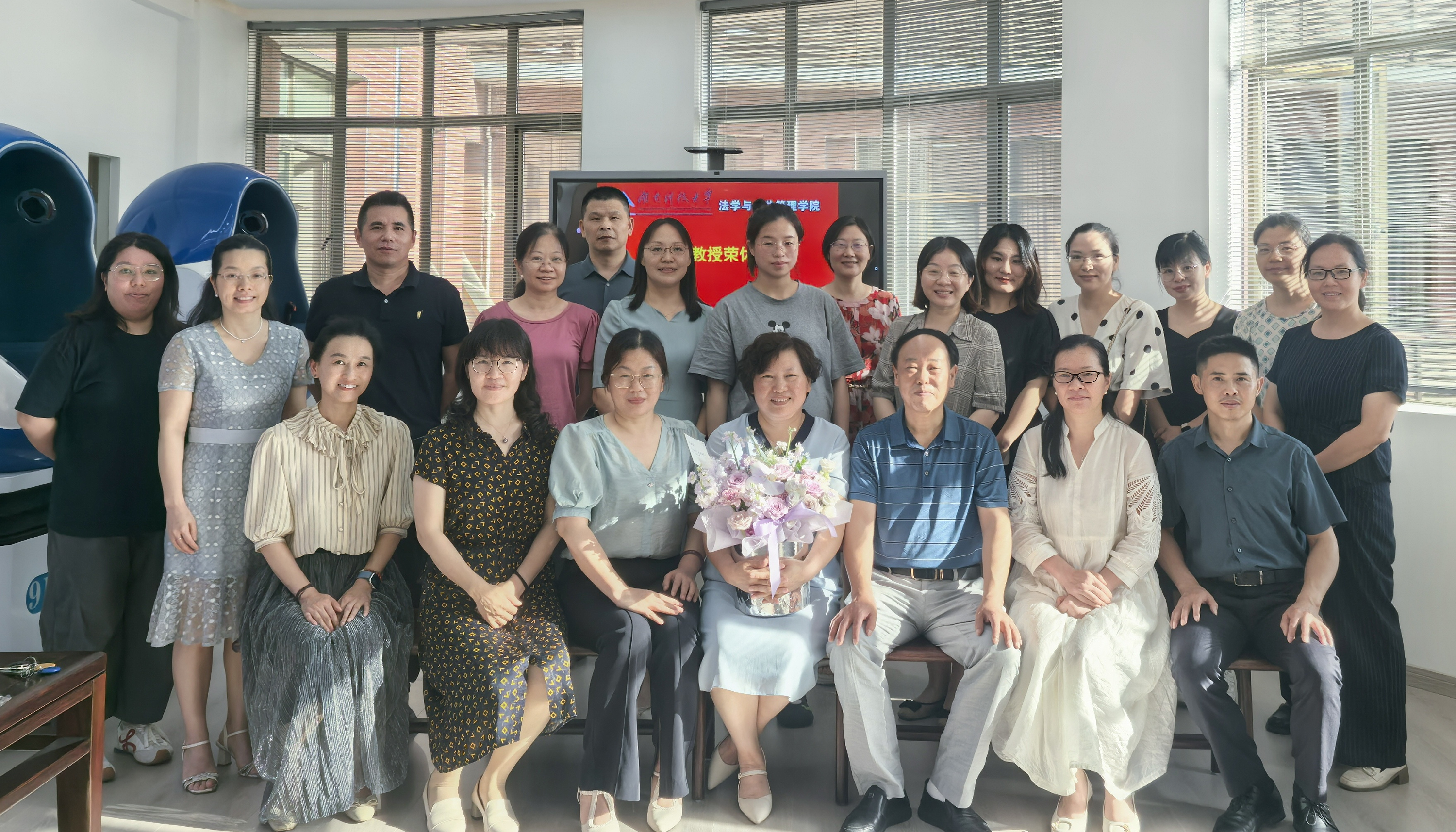 仪式最后,学院领导班子成员共同走向台前,向蒋兰香教授献上鲜花与纪念品。在快门定格的瞬间,全体与会人员共同与蒋兰香教授合影留念,将这份深厚情谊与难忘时刻永久珍藏。这场荣休仪式不仅是对蒋兰香教授教育科研生涯的致敬,更是法治精神与育人情怀的薪火相传,激励着新一代法学人在追求公平正义的道路上笃定前行。
