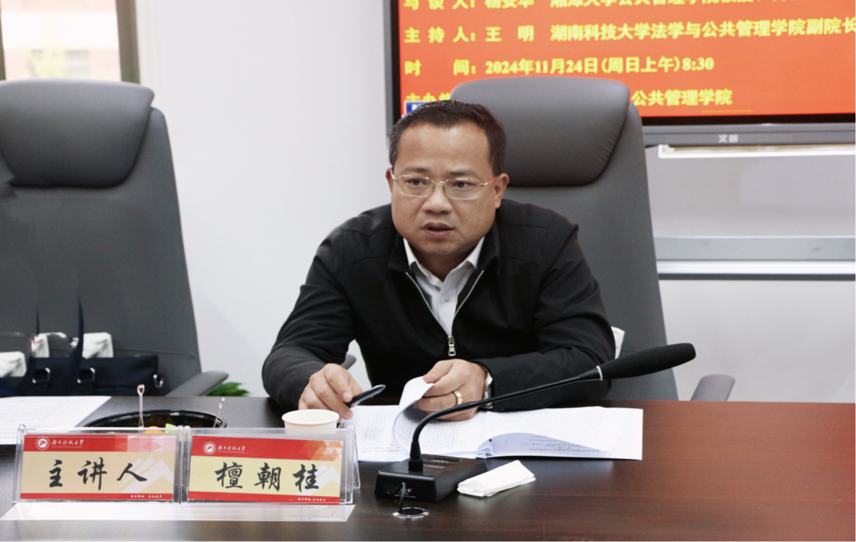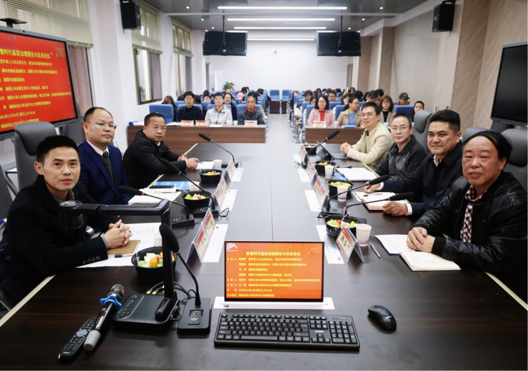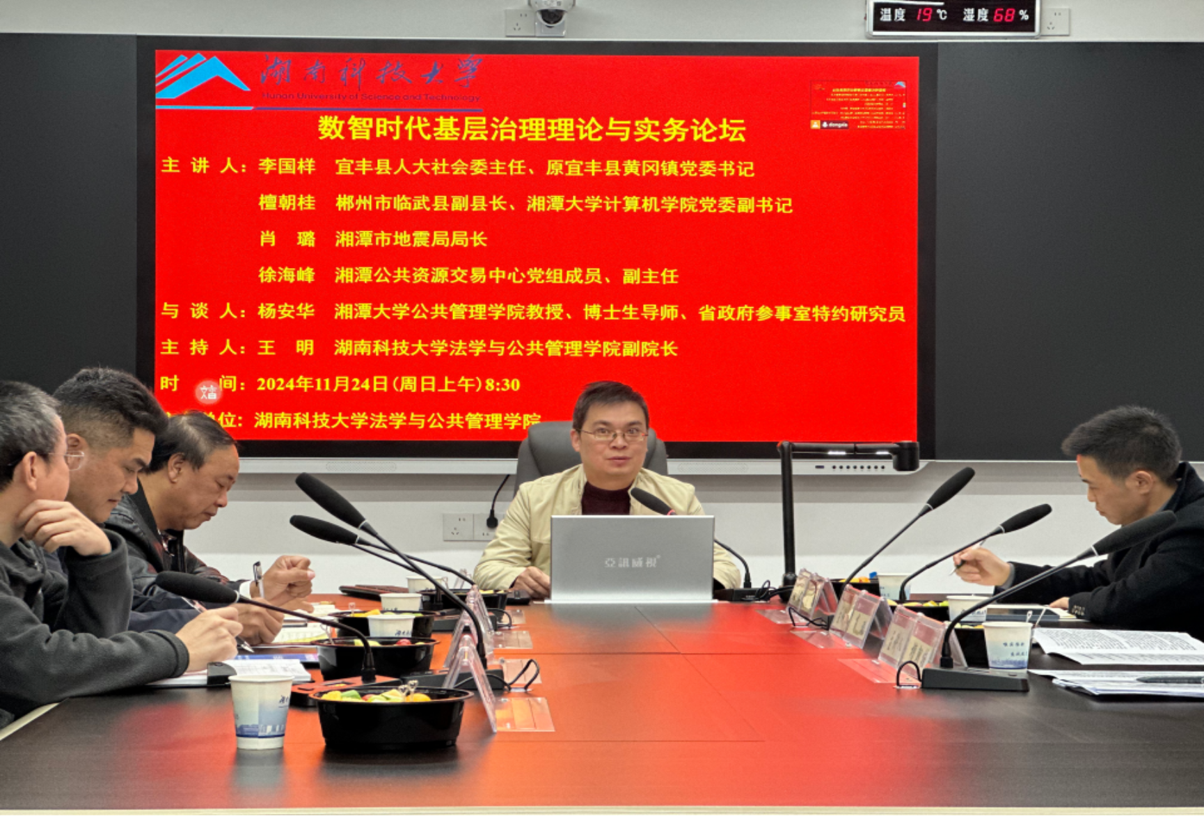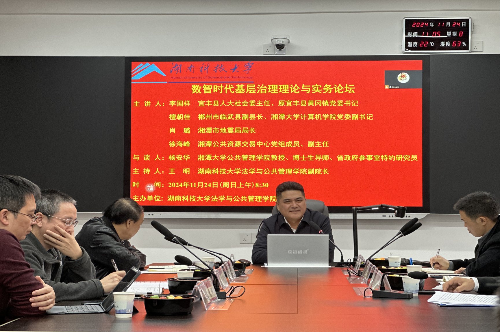 在立言楼A303成功举办了“数智时代基层治理理论与实务”学术论坛。此次论坛邀请了江西省宜丰县人大社会委主任李国样、湖南省临武县副县长(挂职)檀朝桂、湖南省湘潭市地震局局长肖璐、湖南省湘潭市公共资源交易中心副主任徐海峰等人担任主讲嘉宾,湘潭大学公共管理学院教授、博士生导师、省政府参事室特约研究员杨安华担任与谈人,学院副院长王明担任主持人。全院近70名师生参与论坛。
